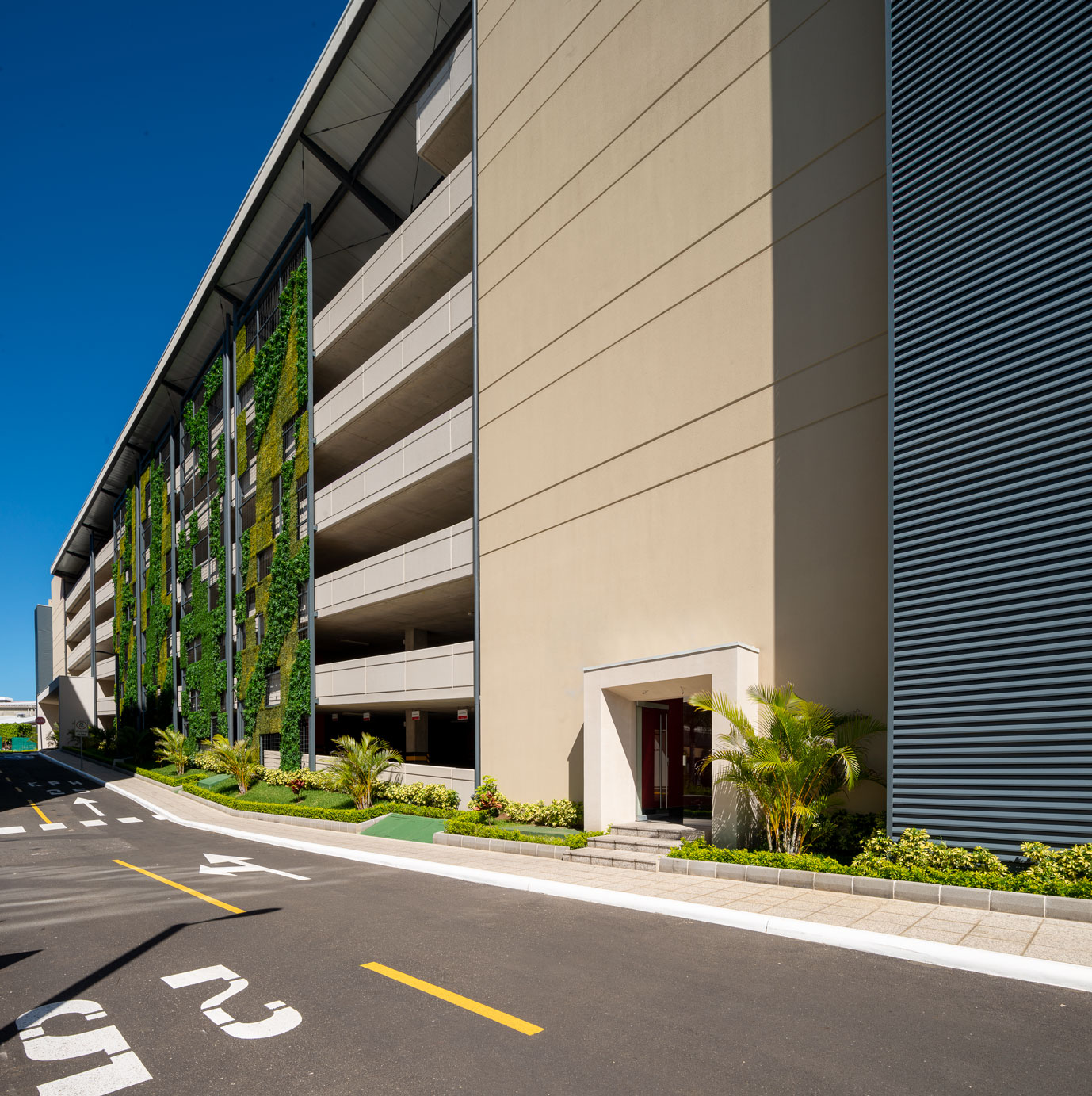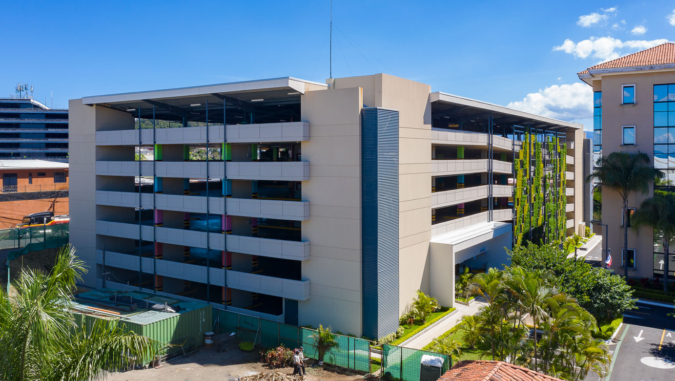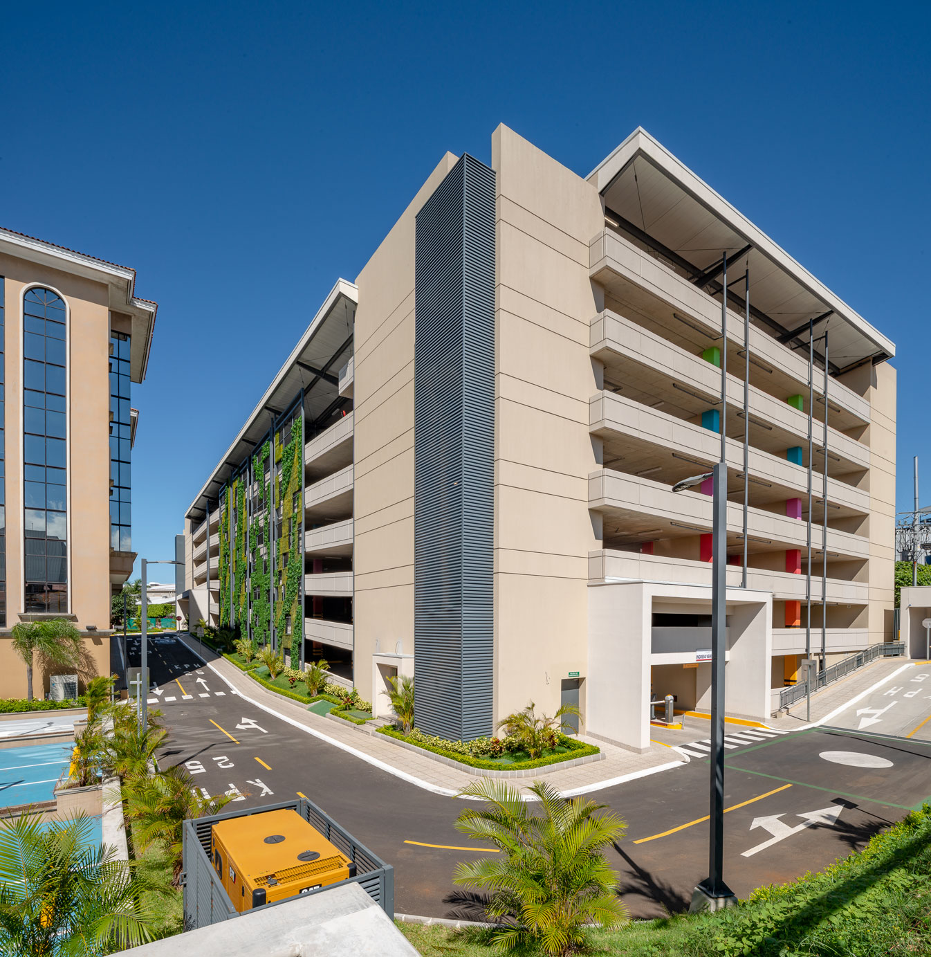 Es un edificio de plataforma de parqueos de seis niveles, que albergan 699 espacios de estacionamiento, 11 bodegas, así como almacenes centrales de los equipos de mantenimiento.