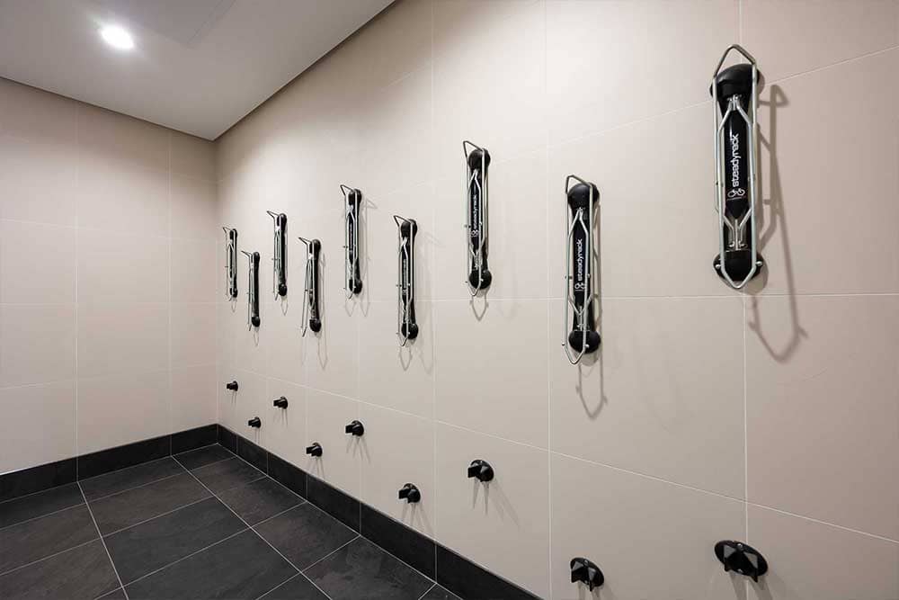 - Public showers in basement